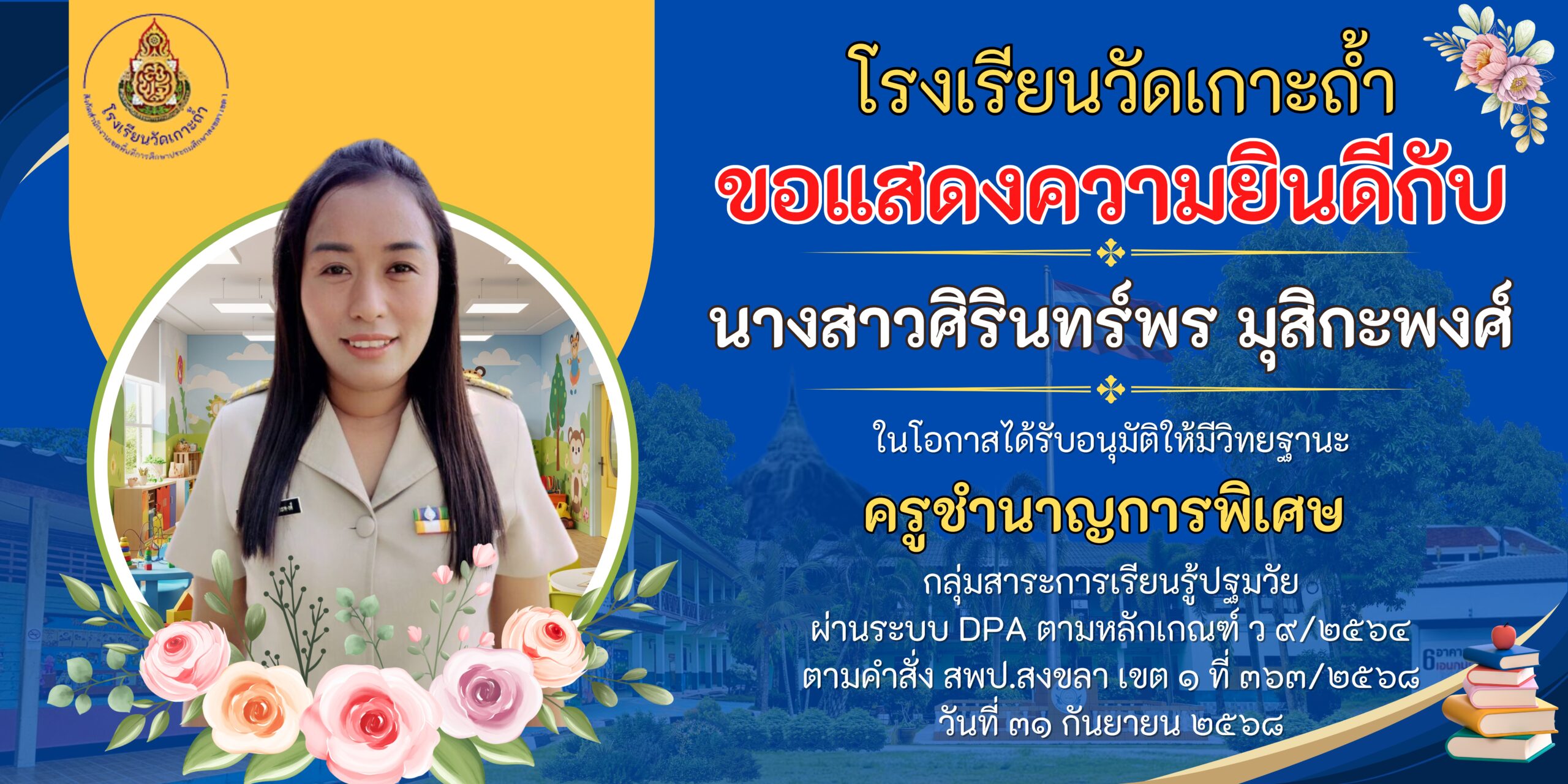 นางสาวศิรินทร์พร มุสิกะพงศ์ ได้รับอนุมัติให้มีวิทยฐานะ ครูชำนาญการพิเศษ กลุ่มสาระการเรียนรู้การศึกษาปฐมวัย ผ่านระบบ DPA ตามหลักเกณฑ์ ว ๙/๒๕๖๔ ตามคำสั่ง สพป.สงขลา เขต ๑ ที่ ๓๖๓/๒๕๖๘ วันที่ ๓๑ กันายายน ๒๕๖๘