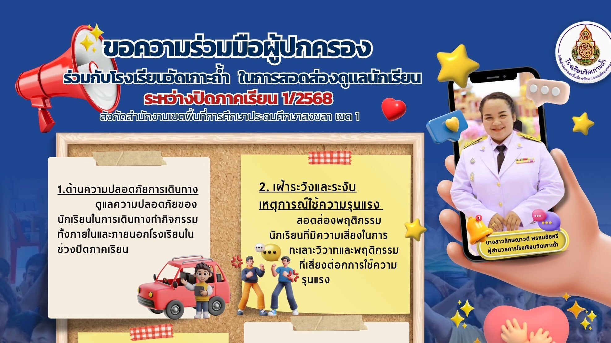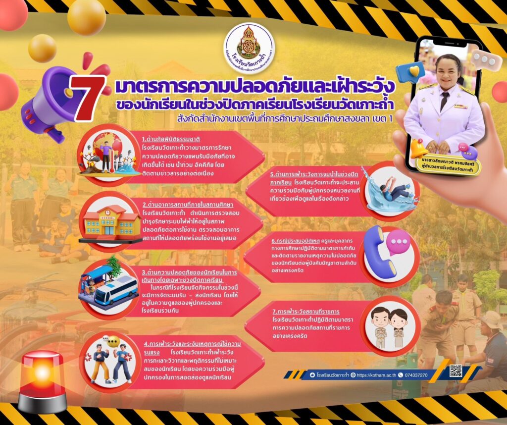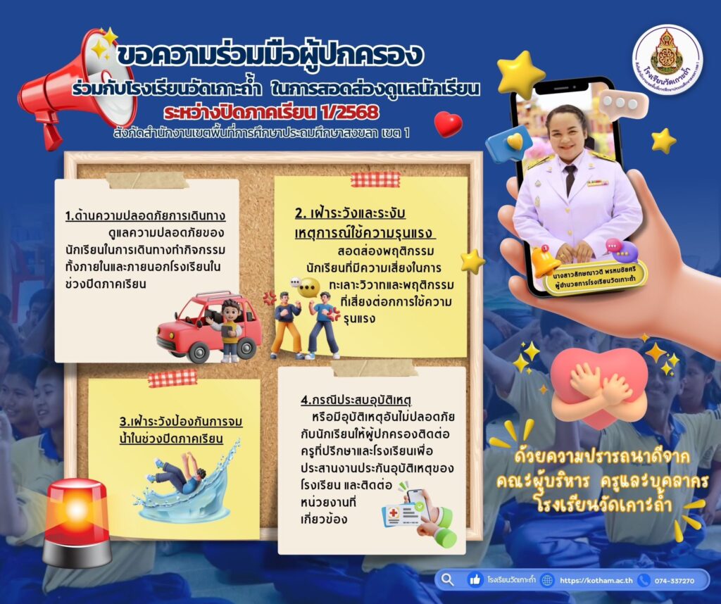 👉โรงเรียนวัดเกาะถ้ำ ขอแจ้งมาตรการดูแลความปลอดภัย แก่นักเรียน ครู บุคลากรทางการศึกษา และขอความร่วมมือจากผู้ปกครองในการติดตาม ดูแล และสอดส่องพฤติกรรมของนักเรียนอย่างใกล้ชิด เพื่อร่วมกันสร้างความปลอดภัย ให้แก่นักเรียนในช่วงปิดภาคเรียน